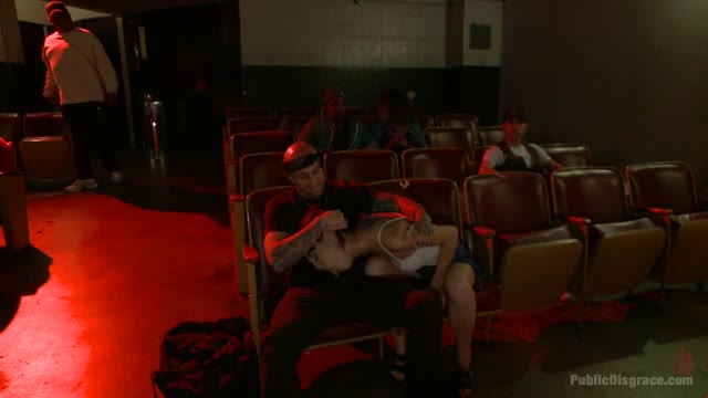 Slinky slut gives it up in an adult movie theater