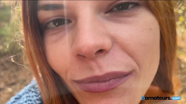 Ginger babe swallows cock in the woods